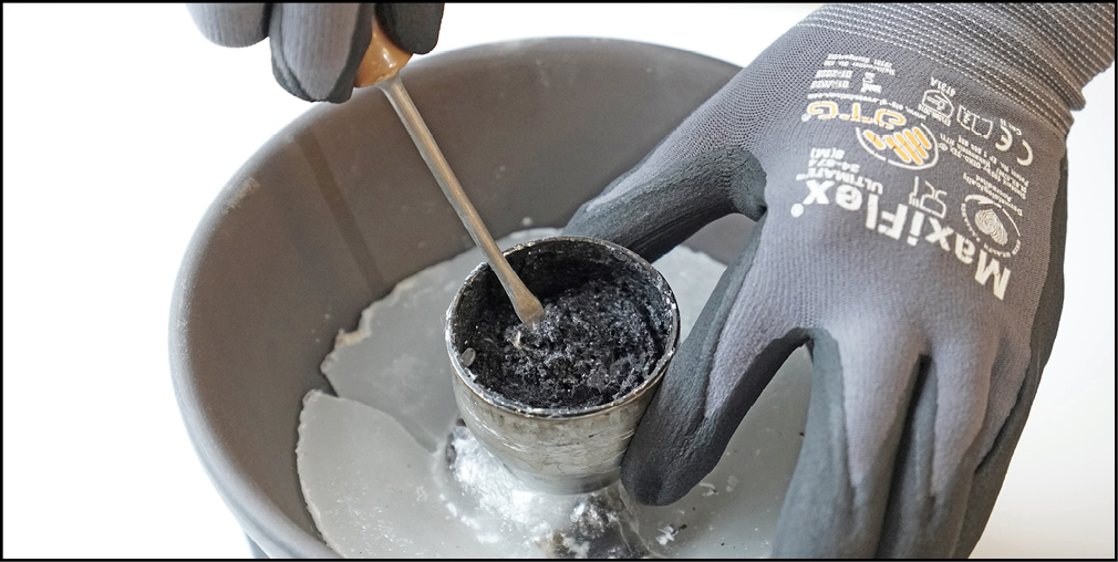 Das Entrußen muss im kalten Zustand erfolgen, verwenden Sie dafür einen Schraubenzieher. Kratzen Sie damit die entstandene Kruste ab. Dies kann ruhig mit nachdrücklichem Kraftaufwand erfolgen, der Docht wird dabei nicht beschädigt. Die vom Ruß zusammengebackenen Glasfasern werden so gelöst. Die dabei freigesetzten Rußpartikel müssen ausgekippt werden.