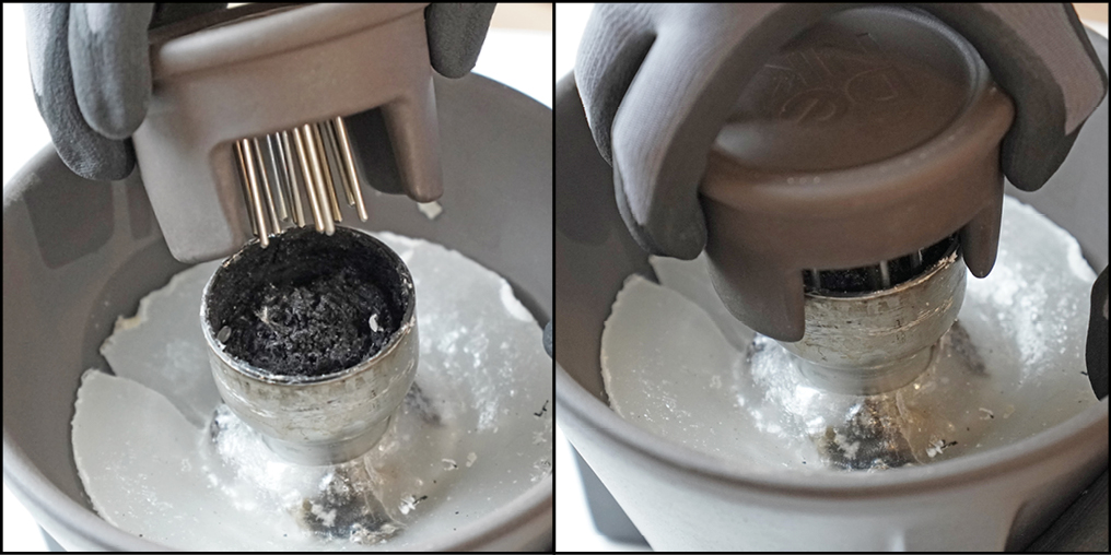 Stellen Sie Ihr Schmelzfeuer für ein paar Stunden in den Gefrierschrank, danach lässt sich der Brenner samt Wachs einfach entnehmen. Nun setzen Sie das neue Innenleben in den Tiegel ein und schon ist Ihr Schmelzfeuer wieder wie neu. Bei der Gelegenheit können Sie den Keramiktiegel auch in der Spülmaschine oder von Hand reinigen.