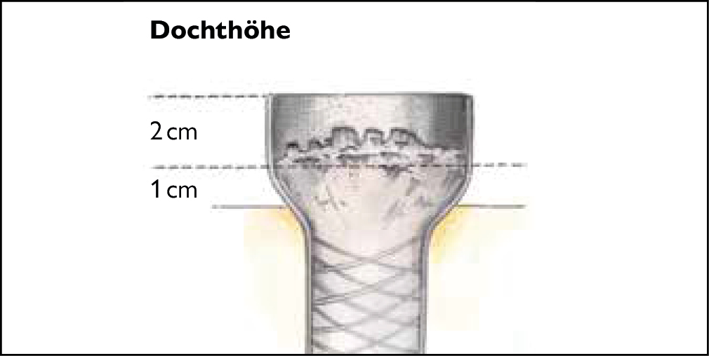 Prüfen Sie, ob der Docht richtig eingestellt ist. Die richtige Position und Form des Dochtes hat maßgeblichen Einfluss auf das Flammenbild. In der Grafik sehen Sie die optimale Position und Form des Dochtes. Sitzt der Docht zu tief im Brenner, ist die Flamme sehr klein, sitzt er zu hoch, entsteht eine zu große, rußende Flamme und der Brennkreislauf wird gestört.
