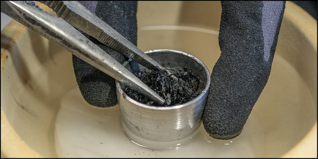 Nun können Sie den Metallbrenner aus dem Tigel entnehmen (1). Bitte tragen Sie hierzu Schutzhandschuhe, es besteht Verbrennungsgefahr. Mit einer Spitzzange/ Pinzette lässt sich der alte Docht aus dem Brenner ziehen. Säubern Sie den Brenner anschließend mit einem Küchentuch.