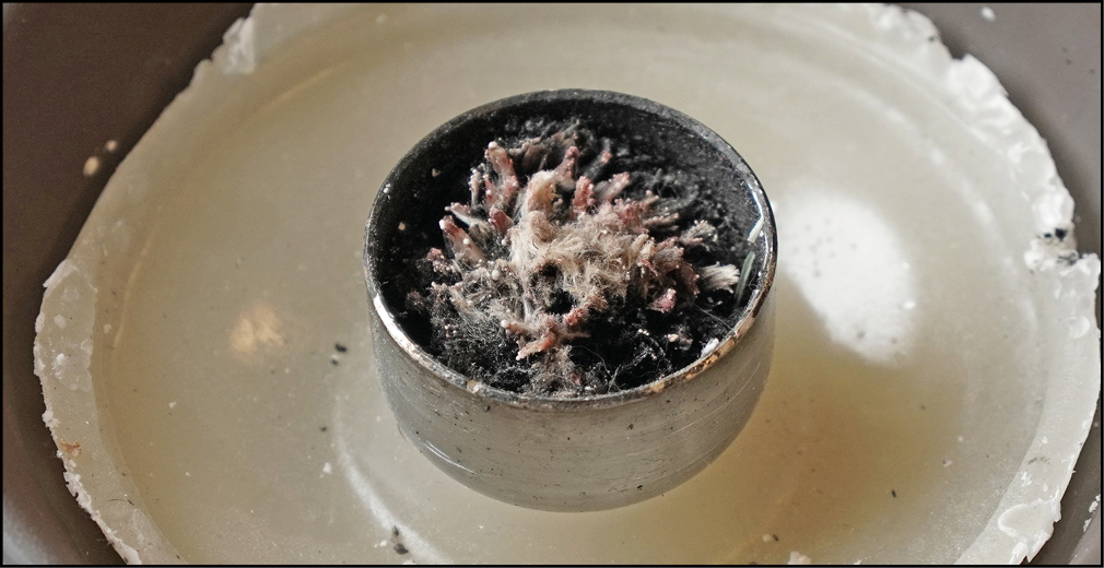 Der Docht des Schmelzfeuers besteht aus vielen kleinen solcher Glasfaserröhren, die diese Eigenschaft besitzen. Durch die Flamme erhitzt sich die Metallhülse, wodurch sich das Wachs im Tiegel verflüssigt. Nun kann der Wachskreislauf in Gang kommen. Lassen Sie Ihr Schmelzfeuer immer mindestens 40 Minuten brennen. Die Glasfasern transportieren jetzt neues Wachs zur Flamme.
