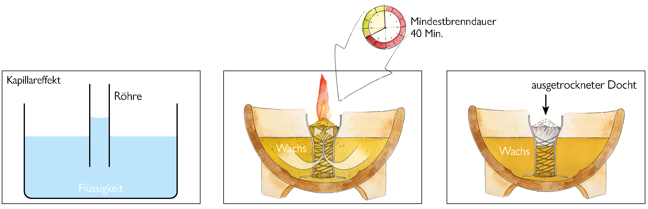 Das Schmelzfeuer setzt sich aus einem mit Wachs gefüllten Tiegel und einem Brenner zusammen, welcher aus einer Metallhülse und einem Glasfaserdocht besteht. Um die Funktion des Schmelzfeuers verstehen zu können, müssen wir uns zunächst mit dem Kapillareffekt vertraut machen. Man könnte ihn vereinfacht so erklären, dass Röhren die physikalische Eigenschaft haben, Flüssigkeiten nach oben zu ziehen. Das geschieht ohne weiteres Zutun.
