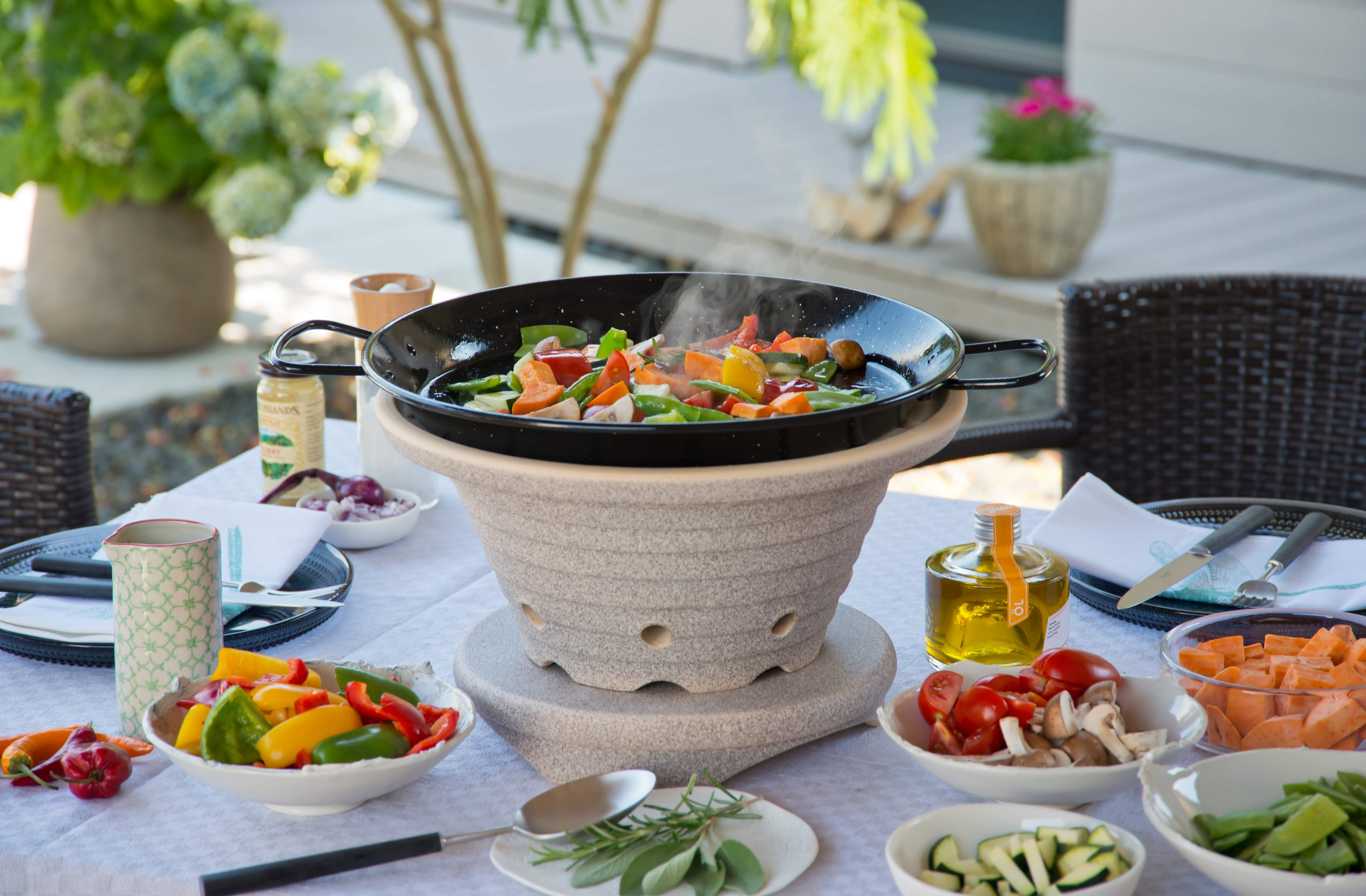 Unser Outdoor-Herd wird mit Schnellbriketts (im Lieferumfang), Holzkohle oder Holz betrieben. Eine Pfanne mit Deckel ist bereits im Set enthalten. So können Sie das ganze Jahr über blitzschnell kochen und braten – ohne Strom und Gas. Das Essen wird auf dem offenen Feuer zubereitet, während alle Gäste sich drumherum versammeln. Diese Art des Kochens schafft eine gemütliche und gesellige Atmosphäre. Die Köchin oder der Koch steht dabei nicht isoliert am Herd, sondern mitten im Geschehen und kann das kulinarische Erlebnis gemeinsam mit allen Anwesenden genießen.