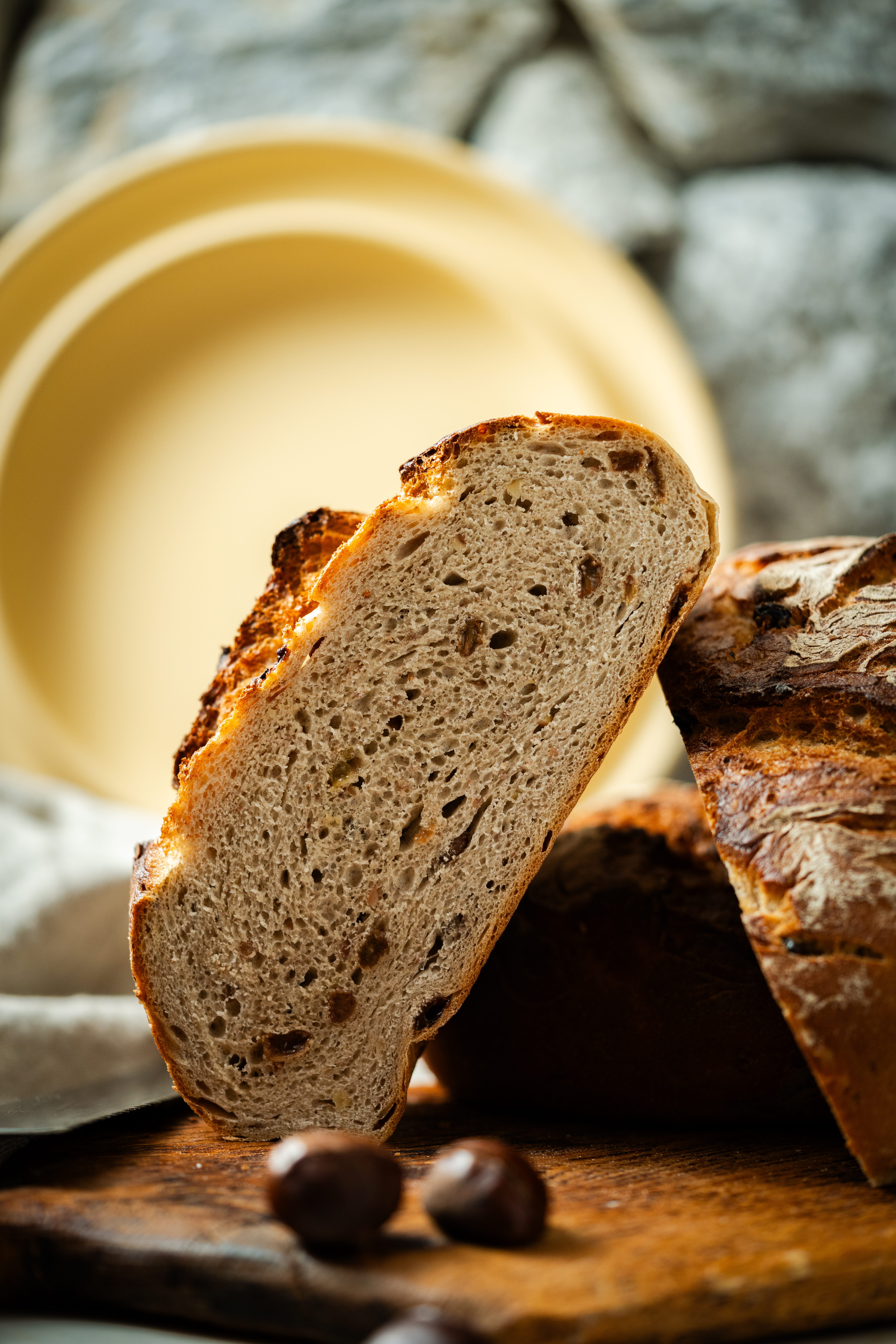 - Den reifen Vorteig mit den restlichen Zutaten für den Hauptteig außer den Maroni und (optional den Rosinen) vermengen. Alles etwa für 5 Minuten zu einem glatten, leicht klebrigen Teig kneten. Erst dann Maroni und – falls gewünscht – die Rosinen dazugeben und den Teig für weitere 5 bis 7 Minuten zu einem glatten, stabilen Teig kneten.